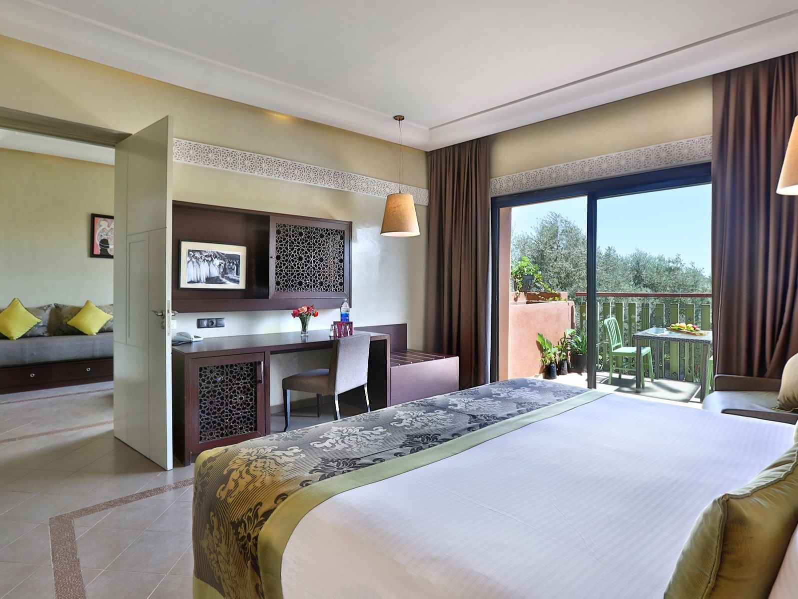 All our Marrakech hotel suites and rooms have balconies or terraces, inviting in the spectacular scenery, the luminous quality of the unspoiled landscapes, in an enchanted setting in the silver olive trees grove, with a stunning, breath taking view of the Atlas Mountains range.