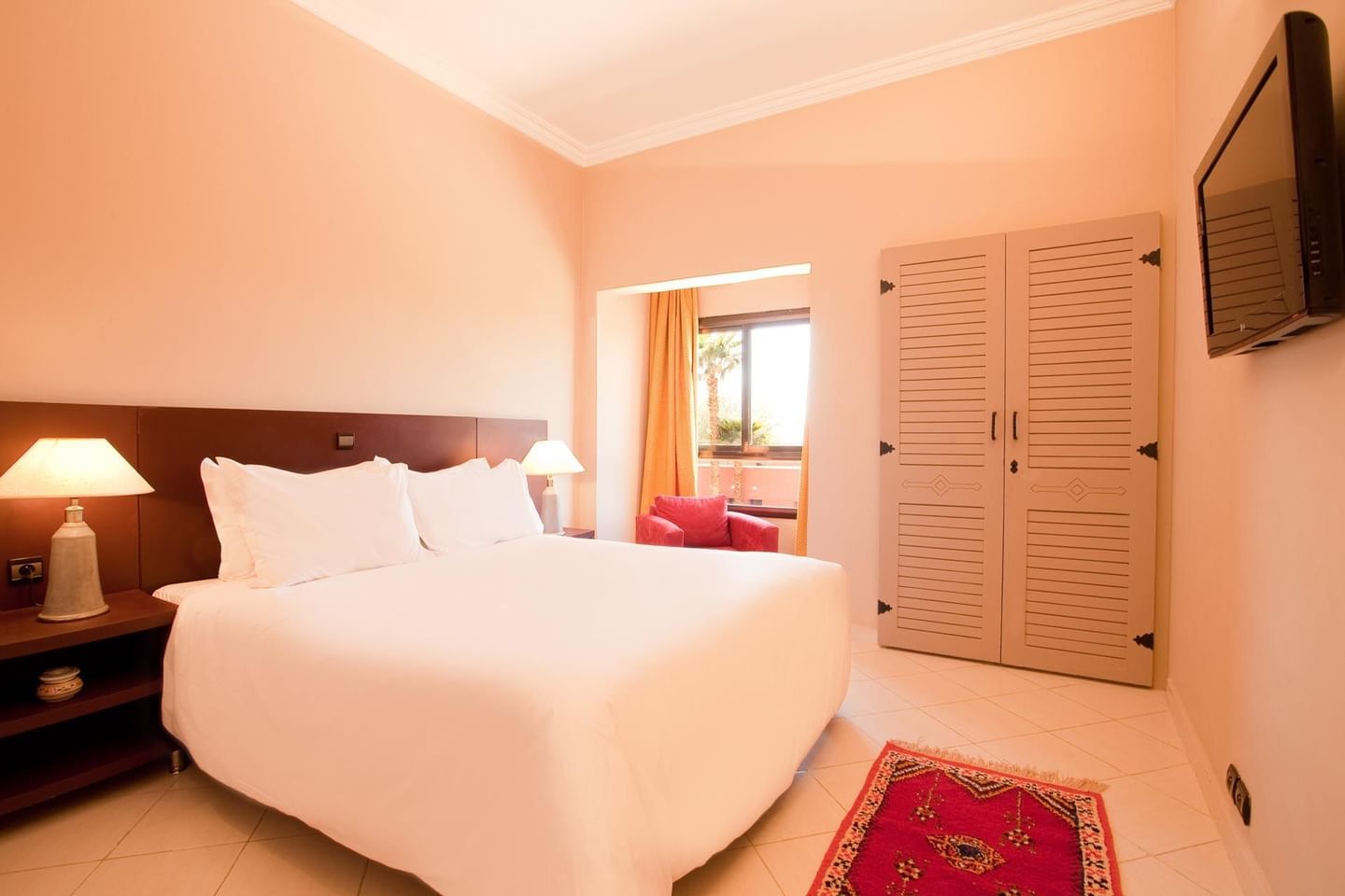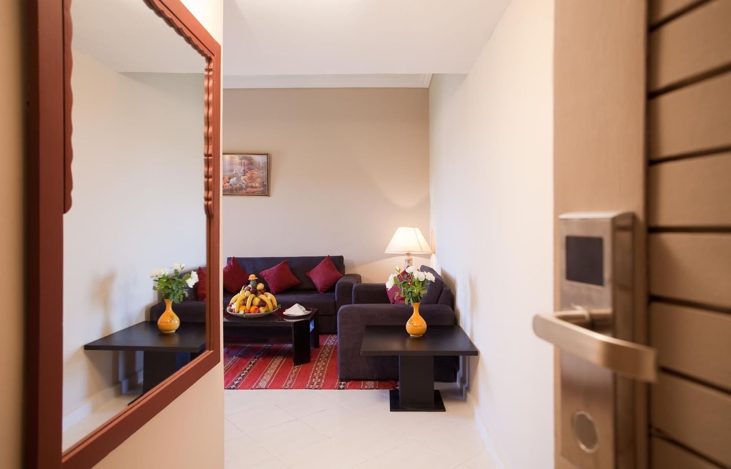 Les 110 chambres et suites de l’hôtel Kenzi Azghor reflètent la beauté et la sobriété de l’art décoratif berbère des hauteurs de Ouarzazate.