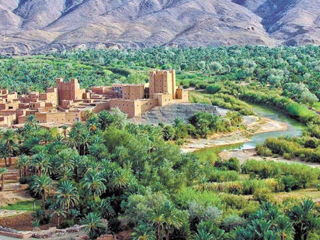 C'est grâce à la présence des rivières Rheris et Ziz qu'ici, à la lisière du désert, s'étend la vaste palmeraie de Tafilalt, à une centaine de kilomètres au sud d'Errachidia. Les sédentaires et les nomades y vivent grâce aux 900 000 palmiers dattiers dont le fruit est un aliment de base de leur régime alimentaire. A proximité se trouve un paysage complètement différent, où les reflets dorés des dunes de sable d'Erg Cherbi s'étendent à l'infini