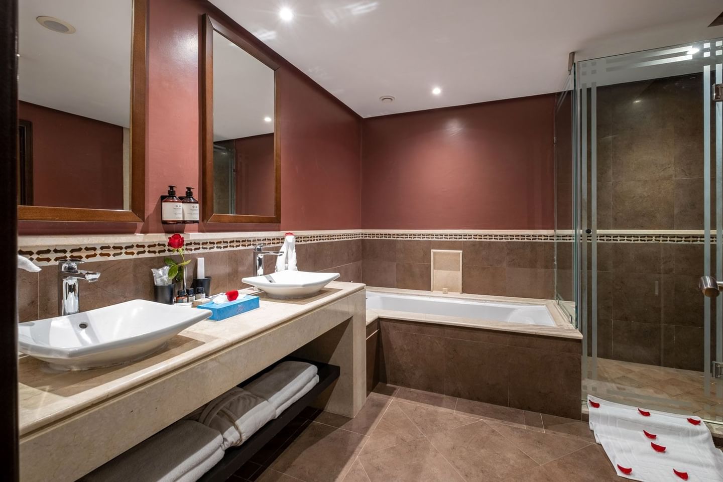 Inspired by the Arabo-Andalusia tradition, the impressionist-style architecture is amazing, a wonder, the decor interprets the ever contrasting theme between noble materials, traditional hues and a palette of tasteful colors: the sheer strength of the wenge carved wood, side by side with the intrinsic sweetness of the Moorish Tadelakts, entwining oriental-style charm, the traditional touch, with the ultimate in World Class luxury, an opulent ‘One Thousand and One Nights’ splendour with World Class amenities and leisure facilities, our Guest has a dream-like stay, hovered between two Worlds, two lifestyles, both of which are synonymous to wellbeing and total pleasure.